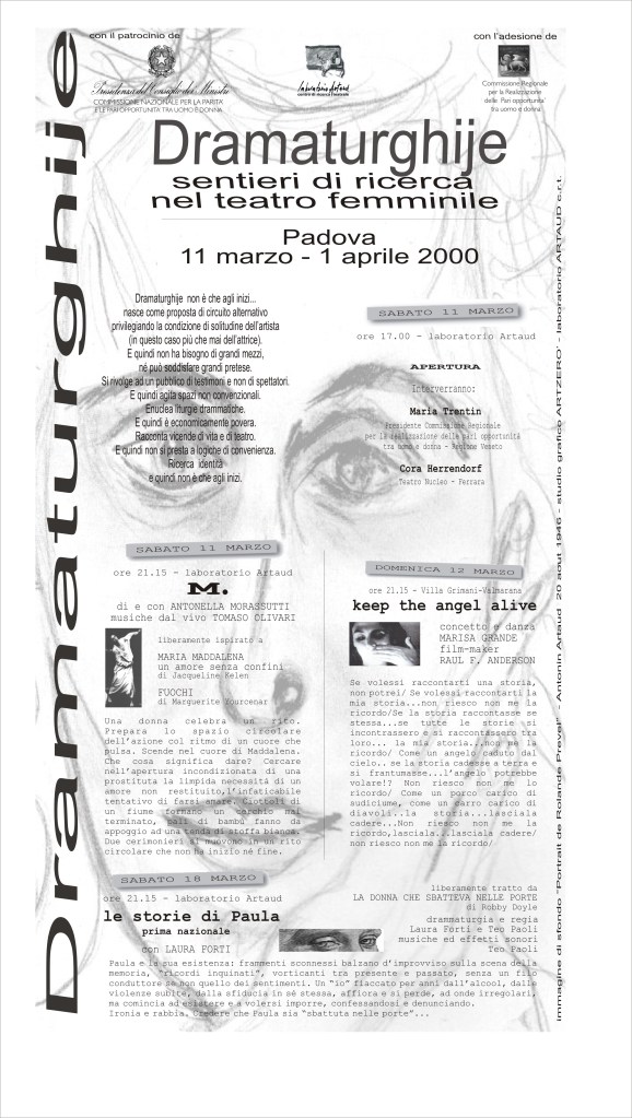 Dramaturghije nasce come work in progress… ma anche come proposta di circuito alternativo. Privilegia la condizione di solitudine dell’attore (in questo caso e più che mai dell’attrice). E quindi non ha bisogno di grandi mezzi, né può soddisfare grandi pretese. Si rivolge ad un pubblico di testimoni e non di spettatori. E quindi agita uno spazio non convenzionale, enuclea liturgie drammatiche e quindi è economicamente povera, racconta vicende di vita e di teatro e quindi non si presta a logiche di convenienza, ricerca identità e quindi non è che agli inizi. Un progetto che, dal 1997 al 2000, ha ospitanto assoli e performances di attrici a livello nazionale e proposto la riflessione dell’essere donna e attrice nel teatro contemporaneo, anche attraverso incontri tematici con alcune personalità-simbolo del teatro italiano di ricerca.