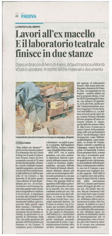 …ringraziamo innanzitutto il Dott. Cristiano Cadoni e Il Mattino di Padova (che a differenza dell’indifferenza de Il Gazzettino) ha pubblicato per la seconda volta, nel giro di questi quattro anni di vessazioni da parte del Comune di Padova, un secondo articolo sulla nostra vicenda. Entrando nel merito dello stesso, ci appare estremamente esplicativo della condizione di danno materiale, esilio, e di condanna a morte delle nostre attività (che non potranno essere chiaramente svolte in due stanzette di 11 mq, non 24 ciascuna come riportato; ma lo sbaglio è stato nostro e non del giornalista). Per quanto riguarda l’ultima parte, la chiosa per par condicio dell’assessore Colasio (colui che ci ha cacciato), riguardo l’apprezzamento del ns. centro di documentazione (che gli fa gola) e riconosciuto dalla Regione Veneto, non c’è nessuna soluzione da trovare: l’unica certezza è che non lasceremo il fondo documentale/patrimonio bibliografico e video-grafico. del ns. centro di documentazione, al Comune e/o alla città di Padova, per colpa sua. Per chi volesse consultare parte del fondo documentale del centro di documentazione pubblicato (tanto il Colasio l’ha già fatto…)